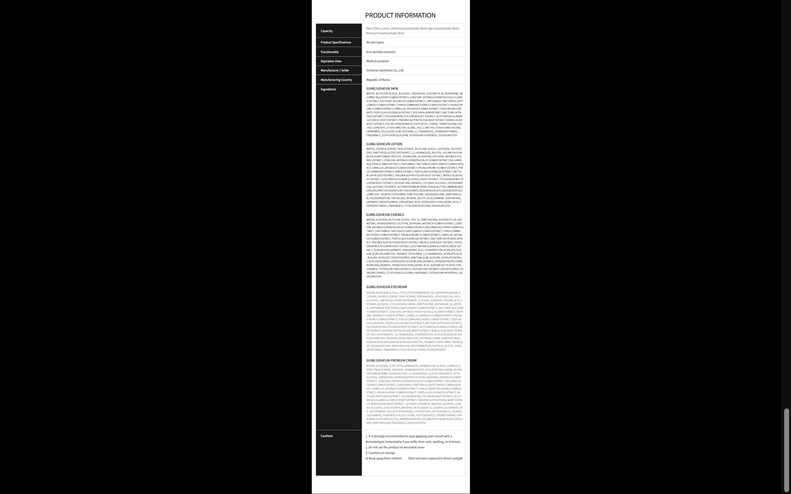 specification : Skin 125ml, Lotion 125ml, Essence(sample 30ml), Eye cream(sample 10ml), Premium cream(sample 30ml)